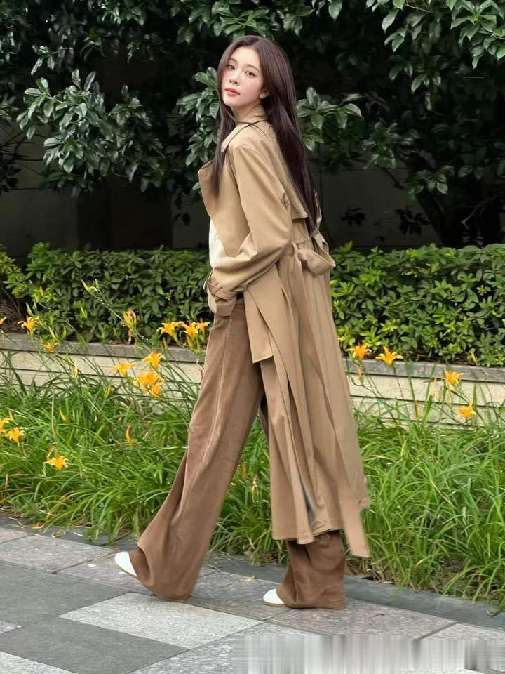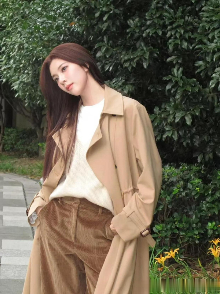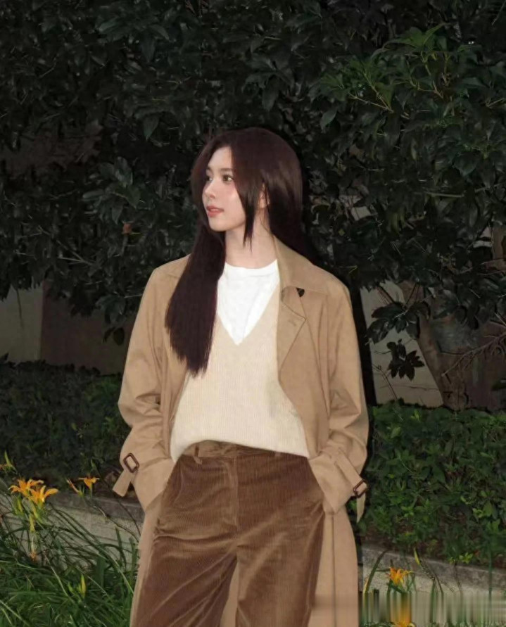 宋妍霏真是穿搭高手! 风衣+V领马甲+灯芯绒长裤, 时髦洋气又高级
