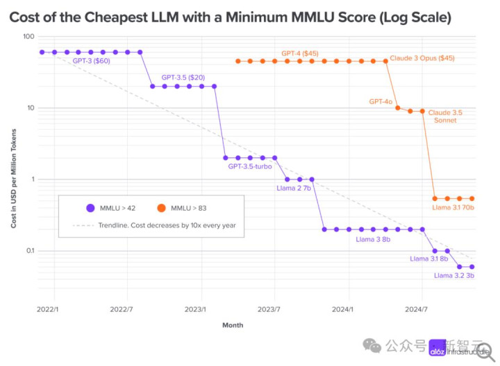 在下面的对数图中,可以看到每百万token每年成本都下降10倍。